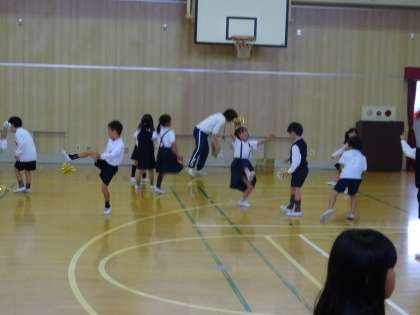 次に、じゃんけんを紹介されました。日本では、「グー」(石)「チョキ」(はさみ)「パー」(紙)です。韓国・朝鮮では、「カゥイ」(岩)「パゥイ」(はさみ)「ポ」(ふろしき)です。ハサミは、同じですが、紙は、韓国・朝鮮では、ふろしきだそうです。となりの国ということで、同じところもあり、またちがうところもあります。じゃんけんの紹介の後、韓国・朝鮮の音楽に合わせて、じゃんけんをするゲームをしました。