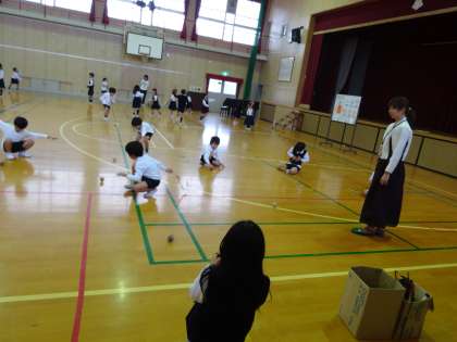 最後に、韓国・朝鮮の3つの遊びを紹介してもらいました。きれいな飾りがついたおもりを足でけり上げる「チェギ」、矢をつぼの中に投げ込む「トゥポ」、木製のコマを帯状のものでたたきながらまわす「ペンイ」です。短い時間でしたが、子ども達は、それぞれの遊びに夢中になっていました。