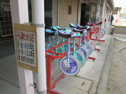 現在、子どもたちの体力づくりをすすめるために、中庭を中心に、整備等を行っているとお伝えしていますが、今回、竹馬と一輪車を購入しました。一輪車は、低学年が使いやすい小さなサイズのものを、竹馬は、高学年が使いやすい大きなサイズのものです。