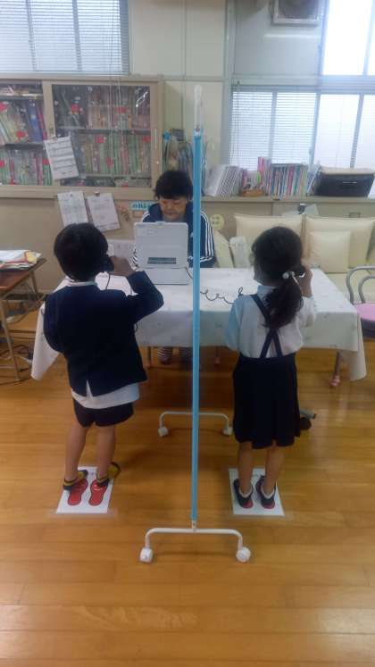 保健室で、オージオメータ(いろいろな音量や周波数の音が流れてきます)を使って、聴力検査をしています。
