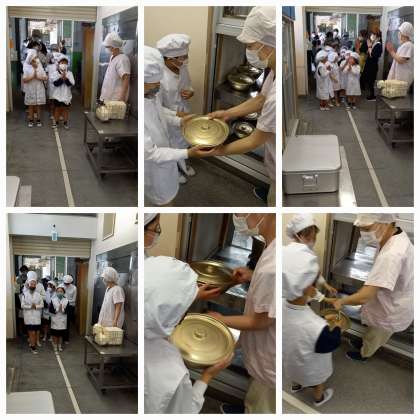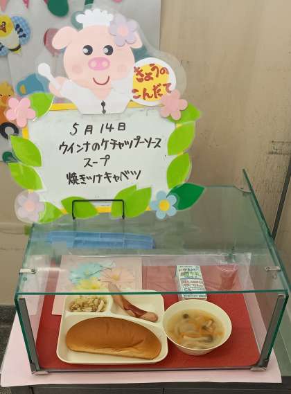 給食室にやってきた当番が、展示食を見て「やったあ!ウインナー」と大喜びしていました(^-^)