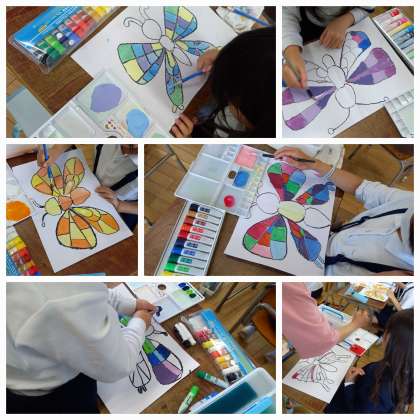 パスで描いたチョウに、絵の具でいのちを吹き込んでいます。
