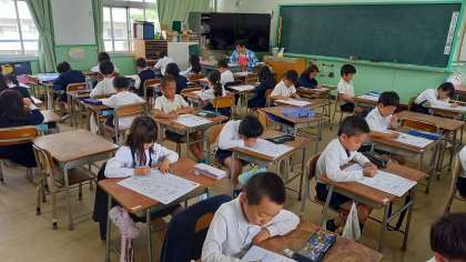 算数のテストに取り組んでいます。 計算ミスをしないように、何度も見直しています。