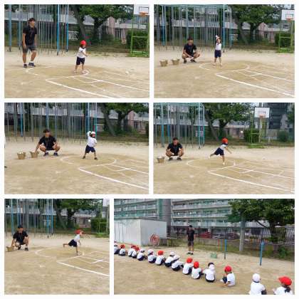 先生から説明を聞き、ソフトボール投げに初挑戦しました。 狙いを定めて、ボールを投げています。
