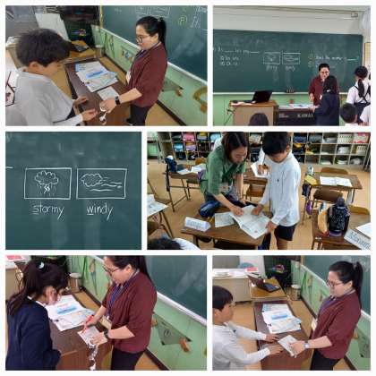 CーNETが天気のカードを指差しながら、今日の天気は?と英語で質問しています。