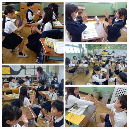 2〜3人組で「茶つみ」に合わせて手遊びを楽しんでいます。