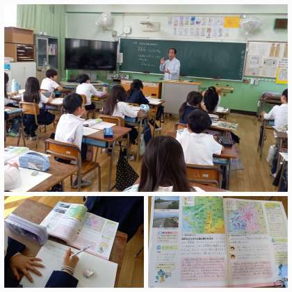 地図を見ながら、気づいたことを話し合っています。