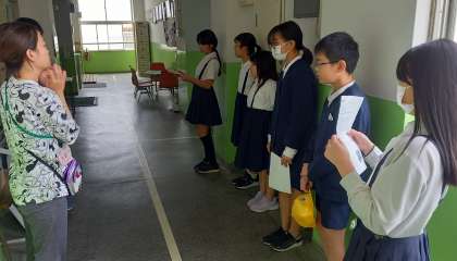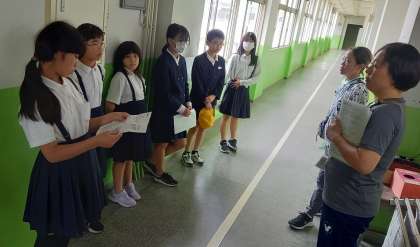 集会委員会の子どもたちが集まり、集会の司会・進行の練習をしています。
