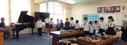 からだほぐし、発声練習のあとは、ピアノにあわせて歌います♪
