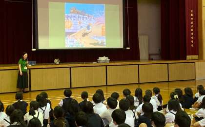 「がっこうにまにあわない」を、全校児童に読み聞かせしました。