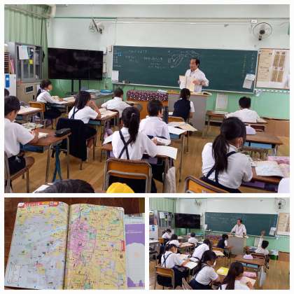 地図帳を使って、大阪市の土地の使われ方について考えています。