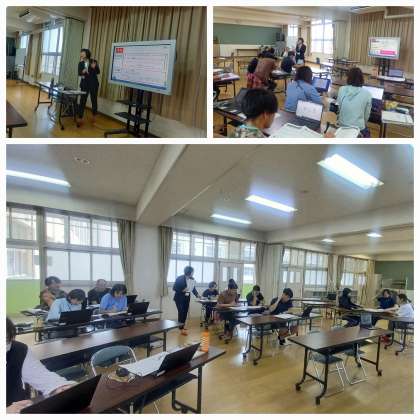 モデル校での実践事例を聞いたり、児童になって模擬授業を受ける体験をしたりしました。