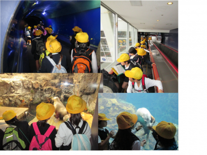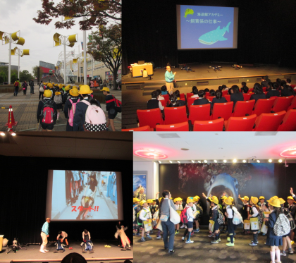 アカデミーの後は、いよいよグループに分かれて、海遊館を見学しました。子どもたちは、いろいろな生き物を間近にして、あちこち目移りしながら、見学していました。生き物だけでなく、飼育員さんに教えてもらった様々な道具なども見つけていました。最後に、サメやエイを実際に触ることができるコーナーがあり、子どもたちは、こわごわと背中にふれていました。当日は、幼稚園や保育園の小さなこどもたちから、中学生や修学旅行の高校生、海外からの観光客などたくさんの観覧者でいっぱいでした。