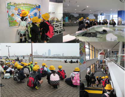 11月14日(金)、3年生は、社会見学で海遊館に行きました。地下鉄で、谷町四丁目駅で乗り換えての長い乗車時間に、少し疲れた様子の子どもたちもいました。しかし、大阪港駅から海遊館に向かうにつれて、大観覧車が正面に見え、海遊館の大きな建物が見えると、子どもたちは目をどんどん輝かせてきました。