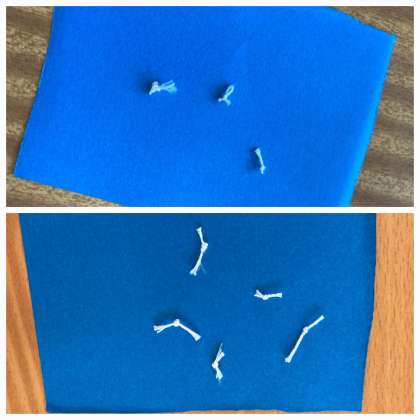 青い画用紙で作ったビオトープに、糸でおたまじゃくしを泳がせています。
