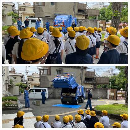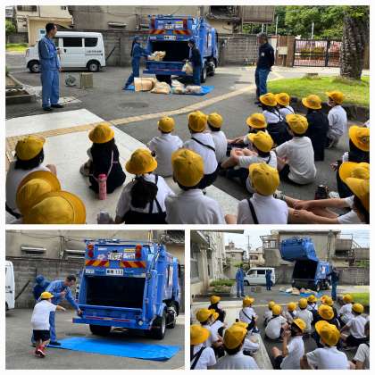 パッカー車にゴミが回収されていく場面を見せていただいたり、実際にゴミを入れる体験をさせていただいたりしました。