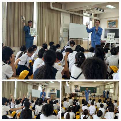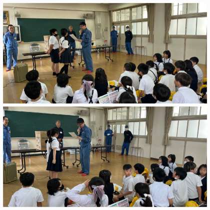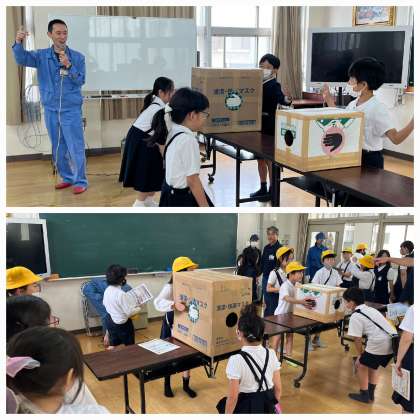 環境局の方は、子どもたちに空気砲の体験や、6枚の牛乳バックで1ロールのトイレットペーパーができるなど楽しく話していただきました。
