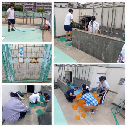 放課後には、教員がプール学習に向けて清掃や用具の準備等を行っていました。