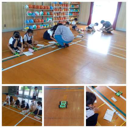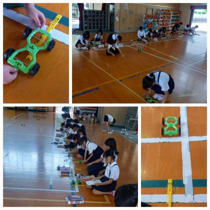 ゴムを伸ばす長さと車が動く距離について、実験しています。