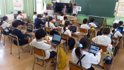 学習者用端末を使って、接続テストをしました。 先生や友達の顔が画面に映ると、思わず笑顔になっていました。