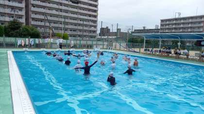 水中で、音楽に合わせて腕を動かしたり底面に手をつけたりしています。