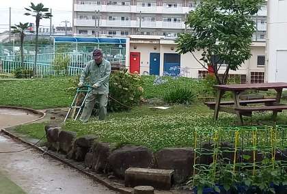 管理作業員が、子どもたちの大好きな中庭(うりひガーデン)の整備をしています。
