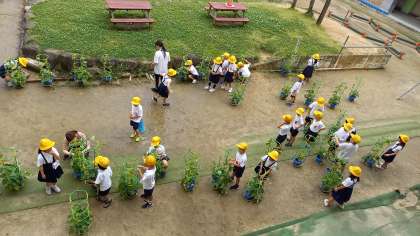 アサガオの支柱の調子を整えたり、成長の様子を観察したりしています。