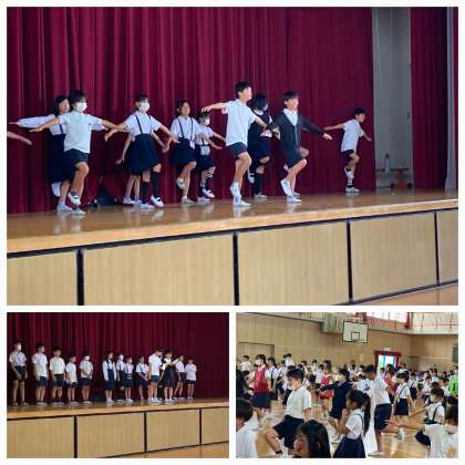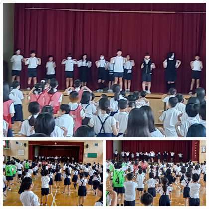 スポーツ委員会と保健委員会の児童がリーダーになり、全校児童で「うりひがストレッチ体操」をしました。