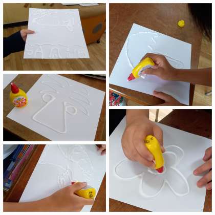木工用ボンドで絵を描き、乾いた後に絵の具で着色していきます。
