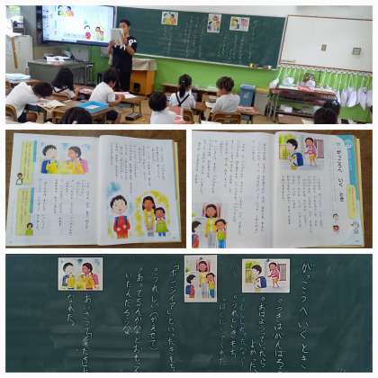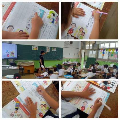 『おはよう』と言う日本の男の子と、『ボンジイア』と言うブラジルの女の子が登場する教材文を通して、互いを知ることで世界のいろいろな国の人と仲よくなることができると気づくことができました。
