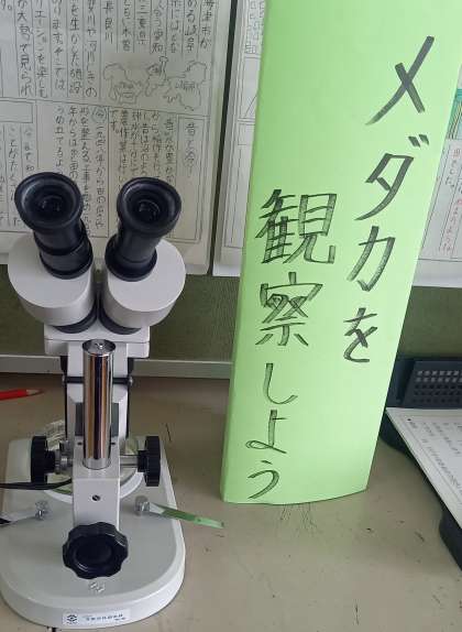 5年生の教室では、いつでもメダカの様子を観察できるように顕微鏡がセットされています。