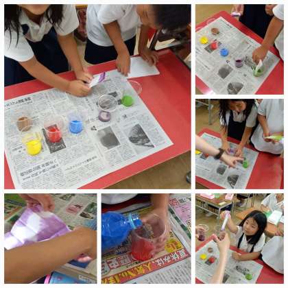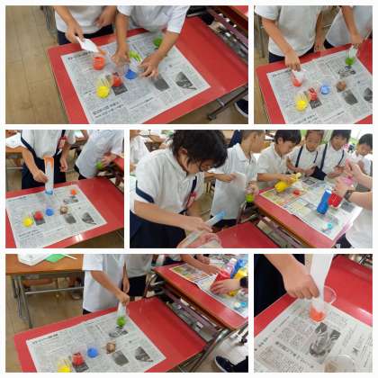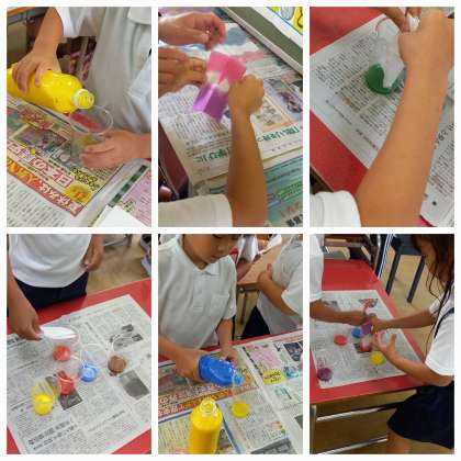 赤・青・黄の3色の色水を自由に混ぜ、おいしいかき氷になるようにカラフルシロップを作ります。