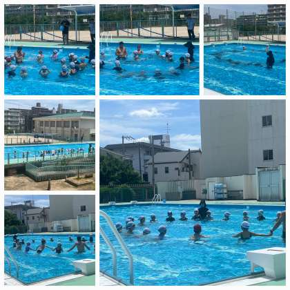 1年生は小学校の大きなプールに慣れ、水遊びの学習を楽しめています。
