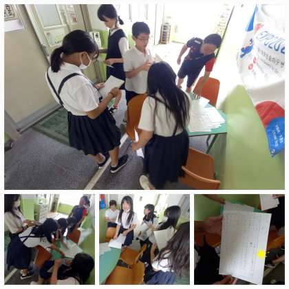 昼休み、職員室前に続々と集まってきた集会委員会の子どもたち。 2学期に向けての準備をしています。