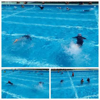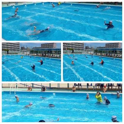 2年生は、プールの底に沈んだ『お宝』を手に入れるために水中に潜っています。