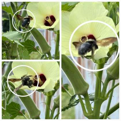 また、オクラの花にやってきた「クロマルハナバチ」(写真を載せています)が、性質は温和で受粉に役立つ存在だということも知ることができました。