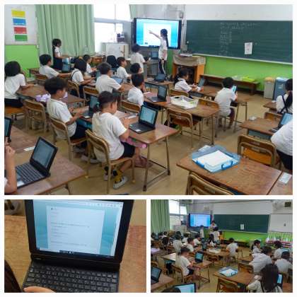 タブレット端末を使って、夏休み読書アンケートに回答しています。