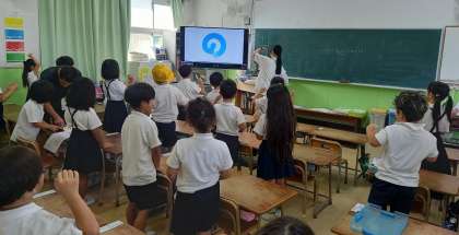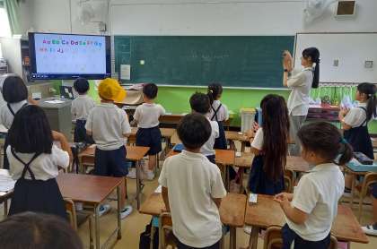 1年生の教室では、体を動かしながらアルファベットを歌っています。
