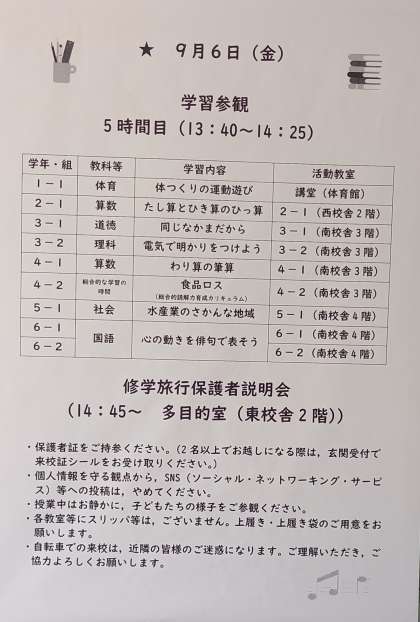 今日の午後は、学習参観・修学旅行保護者説明会があります。