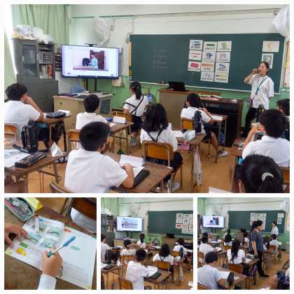 英語で表現されている持ち物の名前を聞き取り、教科書に書き込んでいます。
