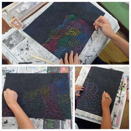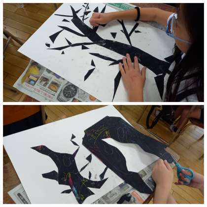 スクラッチアート(黒く塗りつぶした画用紙の下に隠れている色を削って描く表現)したものを切り、大きな木に変身させています。