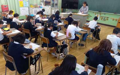 理科のテストに取り組んでいます。 問題文や写真をよく見て、じっくり考えています。