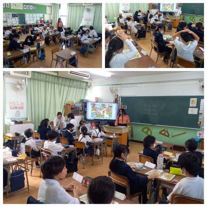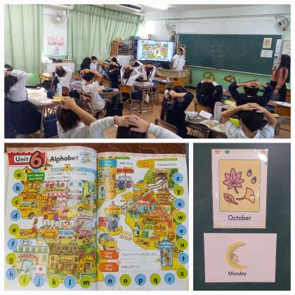教科書を机の真ん中におき、聞こえてきたアルファベットを指差すゲームをしています。