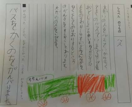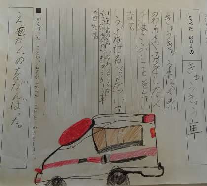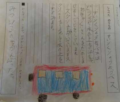 「いろいろなふね」で学習したことを生かして、はたらく乗り物について調べ・まとめました。