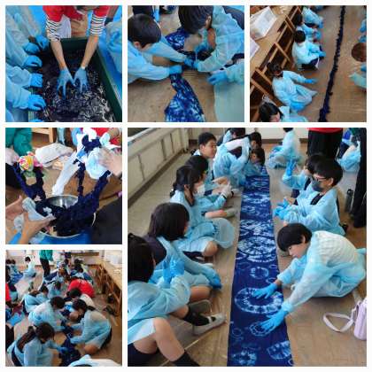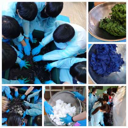 輪ゴムを使って布の絞り作業を終えたら、染料につけ藍で染色しました。