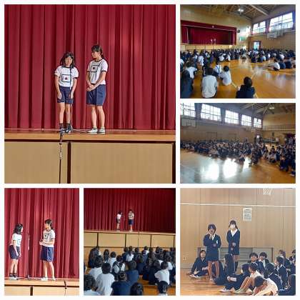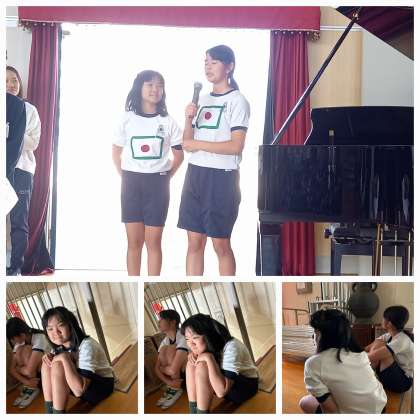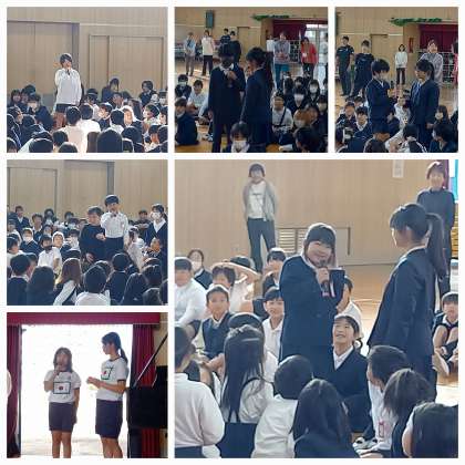 6年生女子の漫才コンビ「ひのまる弁当」が、全校児童の前でネタを披露しました。