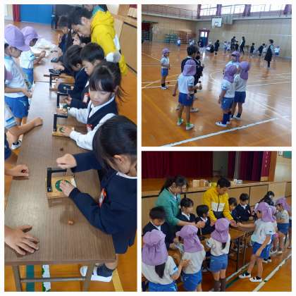 こま・お手玉・けん玉・どんぐりで、1年生と仲よく楽しく遊びました。