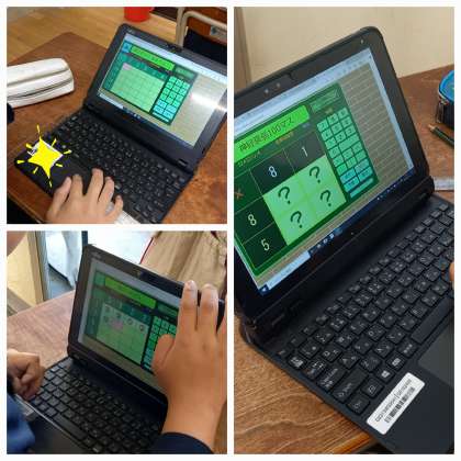 また、タブレット端末を使って百マス計算にも取り組んでいます。