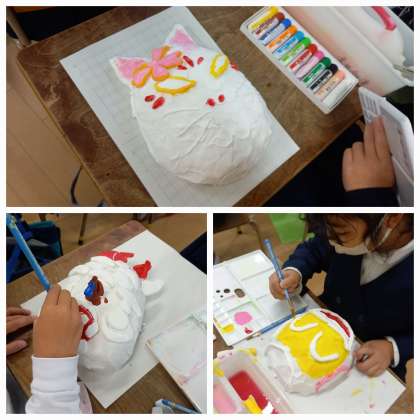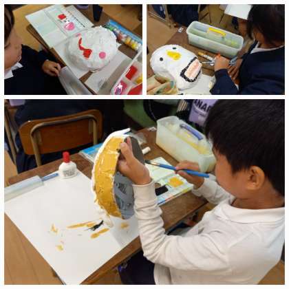はりこのお面に絵の具で色付けしています。