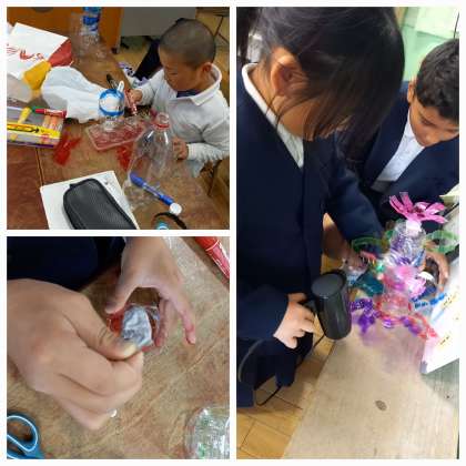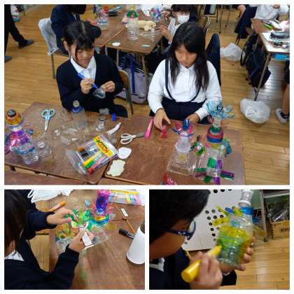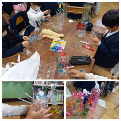 ペットボトルやたまごパックなどの空き容器を切る・折る・貼り付けるなどの工程を重ね、変身させています。
